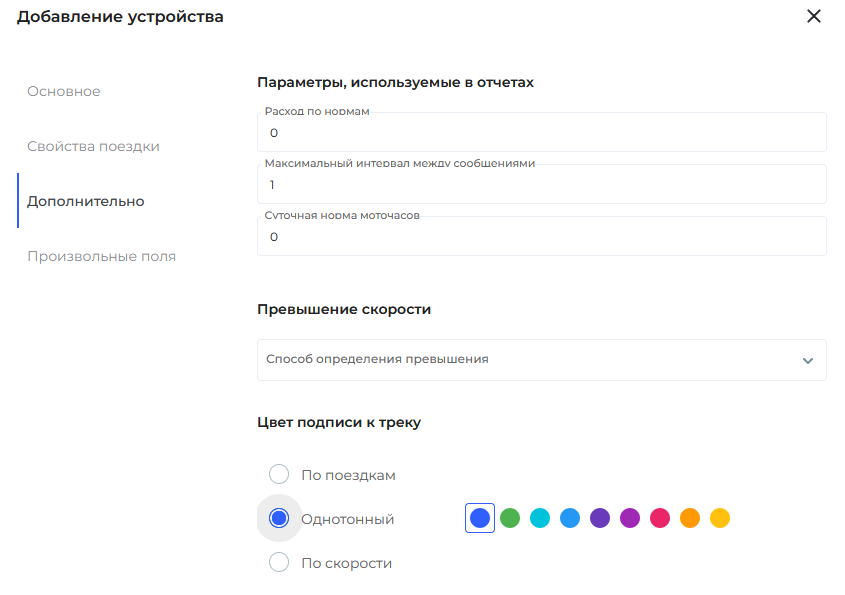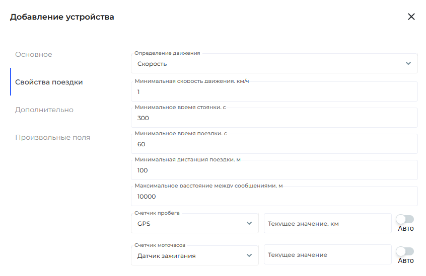 В этом поле указывается, сколько секунд объект должен находиться в движении, чтобы это считалось поездкой. Это помогает системе не ошибаться и не считать короткие перемещения — например, на парковке или в пробке — полноценными поездками. |